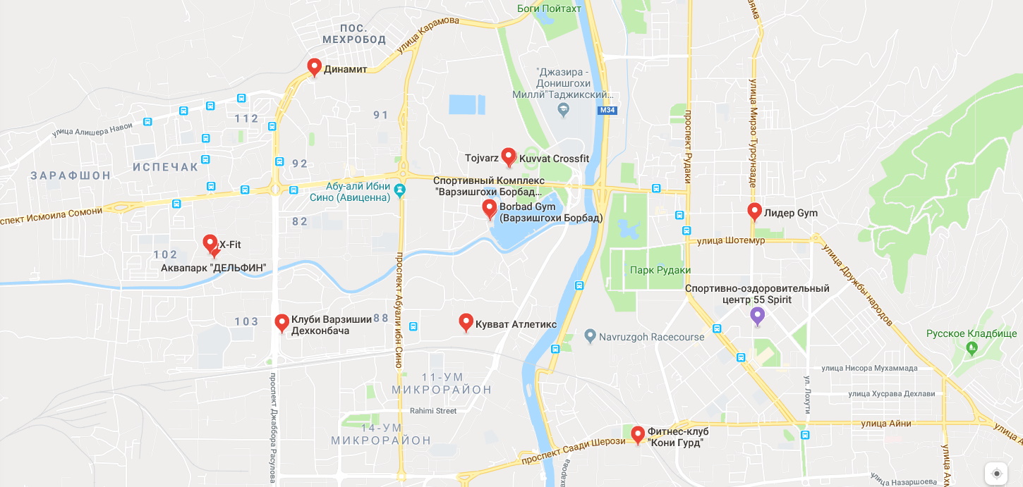 На карте ниже показано расположение некоторых наиболее раскрученных в Интернете фитнес-клубов в Душанбе (нажмите на картинку, чтобы увидеть в лучшем виде).