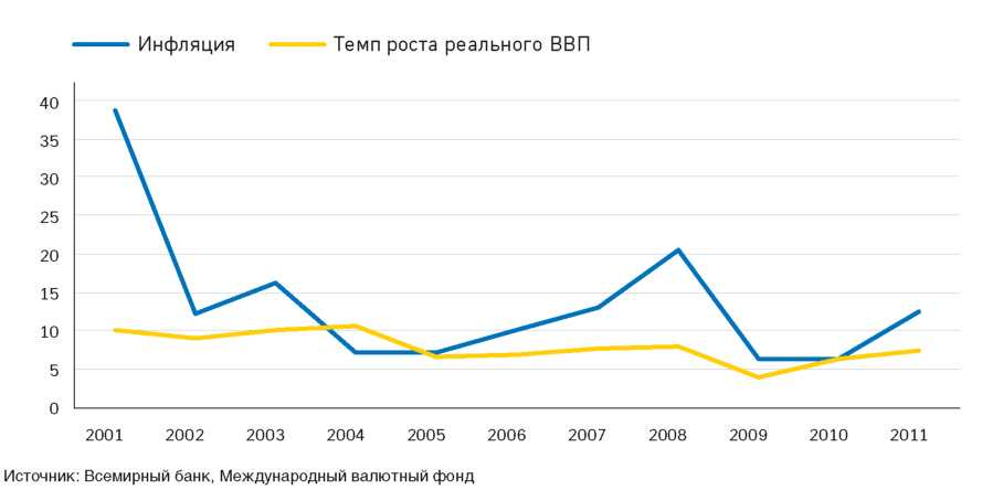 Республика Таджикистан (РТ) расположена в Центральной Азии, в предгорьях Памира. 93% ее территории занимают горы, и лишь 7% составляют равнины, пригодные для земледелия. Население Таджикистана — 7.6 млн человек. Рисунок 2.1. Динамика инфляции и темпов роста реального ВВП, %