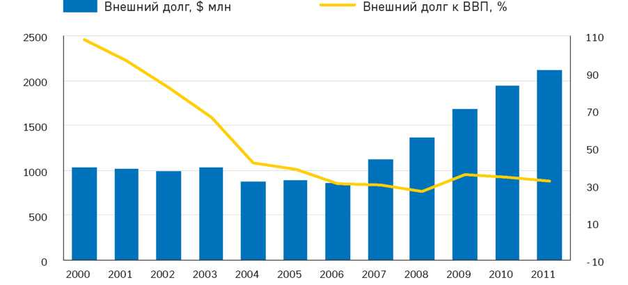 Отношение объема внешнего долга РТ к ВВП снижалось с 2000 года и лишь немного выросло в 2009-2010 годах (см. рисунок 2.3). Этот рост связан с получением кредита, предоставленного Антикризисным фондом ЕврАзЭС. В 2010 году РТ полностью выполнила свои обязательства перед Экспортно-кредитным банком Турции. Большая часть внешнего долга приходится на льготные многосторонние займы Всемирного банка, Азиатского банка развития и международного валютного фонда. Крупнейшими двусторонними кредиторами являются КНР и Кувейтский фонд арабского экономического развития.