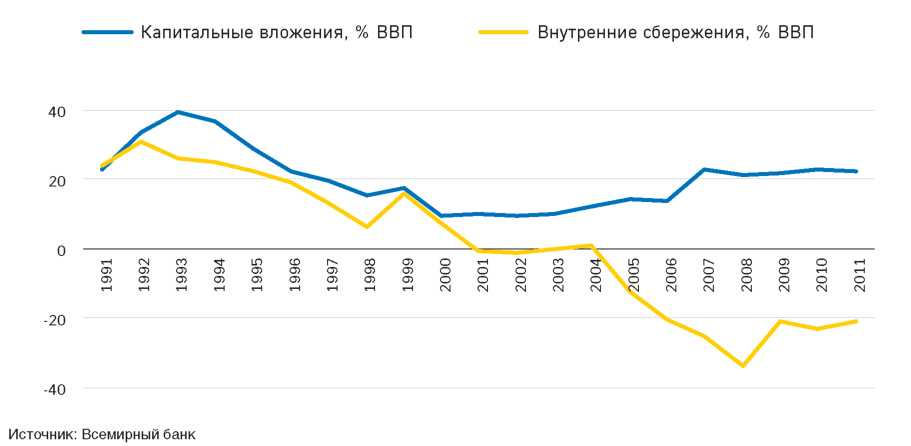 Рисунок 2.4. Динамика капитальных вложений и внутренних сбережений, % ВВП