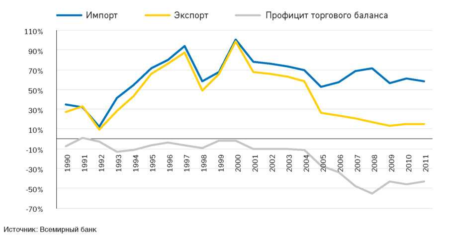 В течение всего периода перехода от плановой экономики с 1992 года динамика внешней торговли характеризуется отрицательным сальдо торгового баланса (см. рисунок 2.5).