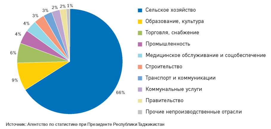 Отраслевая структура занятости практически не изменилась с 1995 года и характеризуется постепенным снижением доли занятых в промышленности и ростом доли занятых в сельскохозяйственном секторе. О роли сельского хозяйства для экономики и социальной сферы Таджикистана свидетельствует то, что с начала 1990-х годов уровень урбанизации населения РТ не превысил 27.5%, что является самым низким значением среди стран ЕврАзЭС.