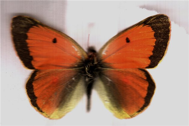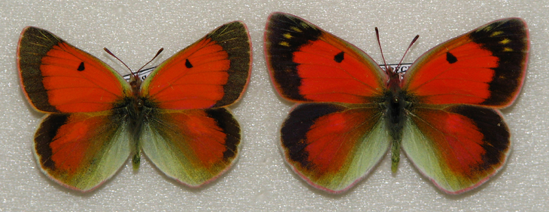желтушка Вискотта (Colias wiskotti Stgr.)Очень редкий вид – великолепная желтушка Вискотта (Colias wiskotti Stgr.). Размах ее крыльев 5 см. Бабочка распространена в горах Киргизии, восточного Узбекистана и Таджикистана и является эндемиком этих мест. Больше нигде в мире эту бабочку не встретишь. Обладает быстрым неправильным полетом, поэтому поймать ее довольно сложно. Названа именем энтомолога Вискотта. Вид был описан немецким энтомологом Штраудингером. Окраска самцов бывает разных оттенков: от лимонно-зеленого до густо-оранжевого цвета. Кроме того, у самцов краевая кайма доходит до середины крыла, в отличие от других представителей этого рода. Самка окрашена не так ярко. Летает желтушка Вискотта высоко в горах Памира и Тянь-Шаня, выбирая склоны, на которых растет острокрыльница. Вероятно, ее листьями питается гусеница. В году дает одно поколение. Численность вида невысока. Нуждается в охране.