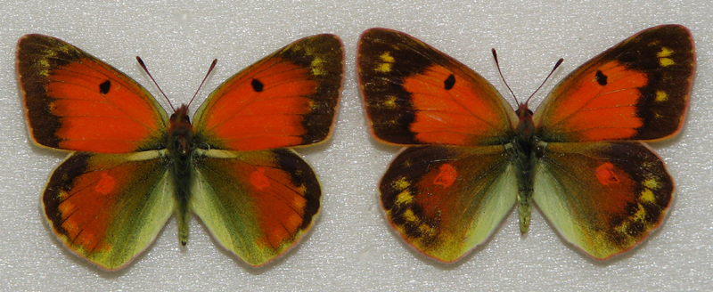 Colias thisoa aeolidesДругая редкая желтушка – эффектная по окраске бабочка Colias thisoa Men. Распространена она на высокогорьях Средней Азии, Алтая, Казахстана и Кавказа. Поднимается на высоту до 3000 метров. Бабочка летает на разнотравно-луговых участках субальпийского пояса с середины июня до начала августа. Для желтушки тизоа характерен половой диморфизм: у самца на оранжевых крыльях узкая черная краевая кайма, в то время как у самки задние крылья совсем черные с ярким оранжевым срединным пятнышком, а почти половину передних крыльев занимает широкая черная кайма с желтыми «окошечками». Биология желтушки тизоа почти не изучена. Этот вид был внесен в Красную книгу быв. СССР и требует охраны. Вот еще несколько видов желтушек, обитающих в Таджикистане: Colias eogeneColias alpherakyiColias regiaColias staudingeri pamiraColias romanovi