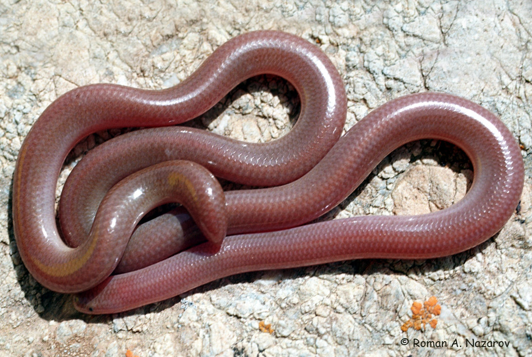 Слепозмейка обыкновенная, или слепозмейка червеобразная (лат. Typhlops vermicularis) — вид змей из рода Слепозмейки (Typhlops) семейства Слепозмейки (Typhlopidae). Мелкая змейка, длиной до 38 см вместе с хвостом, по внешнему виду напоминающая дождевого червя. Очень короткий хвост, относительно более длинный у самцов, укладывается в длине туловища 38—55 раз. Морда несколько приплюснута и закруглена. Большой межчелюстной щиток сильно заворочен на верхнюю поверхность головы, где его задний край почти достигает линии, соединяющей глаза. Носовые щитки большие, не соприкасаются друг с другом позади межчелюстного. Предглазничный примерно равен по величине глазничному и касается второго и третьего верхнегубных. Глаза скрыты под увеличенными щитками и просвечивают наружу в виде небольших темных пятен. Гладкая блестящая чешуя расположена в 22—24 продольных ряда. Окраска верхней стороны тела коричневатая или красновато-розовая, более темная на хвосте. Низ более светлый. На спине и боках обычно хорошо заметны узкие темные линии, соответствующие границам между продольными рядами туловищных чешуи. В отличие от остальных змей слепозмейки обычно линяют, не выходя на поверхность почвы. При этом линяющий эпителий не выворачивается наизнанку, а сохраняется в виде своеобразных упругих трубочек внутри проложенных в земле ходов.
