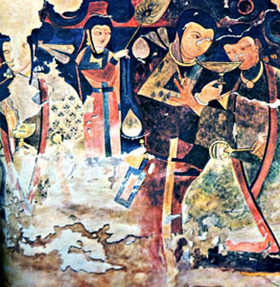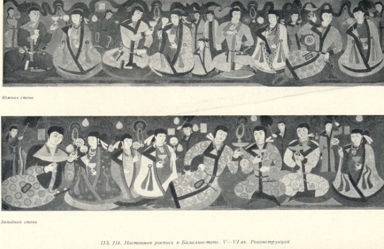 Искусство Тохаристана в VI – начале VIII в.Из книги Б.Г.Гафуров “Таджики. Древнейшая, древняя и средневековая история” ЖивописьНаиболее полно живопись представлена в Балалык-тепе и Аджина-тепе. В квадратном помещении (4,85×4,85 м) Балалык-тепе на плоскости стен на темно-синем фоне развертывается непрерывная полоса изображений. Это пиршественная сцена, в которой участвуют мужчины и женщины, сидящие или возлежащие на ковриках. Эти фигуры обращены друг к другу в три четверти. На втором плане изображены стоящие слуги, они примерно в два раза меньше сидящих фигур. Пир в разгаре: Открывший этот замечательный памятник Л. И. Альбаум полагал, что живопись Балалык-тепе воспроизводила «сцену культового пиршества. Но так как в идеологии раннесредневекового общества культ тесно переплетался с бытом, то эту сцену можно назвать и бытовой». Л. И. Алвбаум приводит ряд доводов в пользу своего мнения, но считать его доказанным нельзя. Правы Г. А. Пугаченкова и Б. А, Литвинский, считающие, что это светская живопись – изображение пира, столь обычного в быту знати того времени. Конечно, дальнейшая детализация содержания этой росписи очень сложна. Г.А.Пугаченкова попыталась объяснить ее как воспроизведение одного сюжета из «Шах-наме. Особых оснований для этого как будто нет. Скорее всего, это достаточно обобщенное воспроизведение пиршества при дворе одного из местных правителей или крупных феодалов. Балалык-тепинские росписи выполнены с большим искусством. Яркая и красочная роспись была чрезвычайно жизнерадостной. Имеется определенный элемент условности: повороты головы и корпуса фигур различны и не согласованы, лица лишены психологической трактовки, бесстрастны. Живописная манера характеризуется плоскостностью. Каждая крупная фигура, пишет В. А. Нильсен, – это идеализированное изображение знатного лица. «Налицо отсутствие реалистической характеристики и некоторая условность». Вместе с тем детали одежд, всякого рода аксессуары проработаны любовно и тщательно. Л. И. Альбаум показал связи и значение живописи Балалык-тепе. Следует также подчеркнуть, что, как считает один из крупнейших современных зарубежных знатоков искусства Востока М. Буссальи, открытие Балалык-тепе «неоспоримо показывает, что уже в V столетии западная область среднеазиатского мира (так он называет Тохаристан.- Б. Г.) почитала стили и тенденции «иранизирующего» типа, которые сасанид- скому искусству или чужды или же во всяком случае достаточно ясно не документированы. Поэтому мы должны признать, что некоторые тенденции, развившиеся в центрах Сериндии, в действительности повторяют восточноиранское (т. е. среднеазиатское.- Б. Г.) творчество. Проникновение этих тенденций в Сериндию (Восточный Туркестан) М. Буссальи связывает с развитием торговли и экономических связен. С другой стороны, как отмечает этот исследователь, искусство Балалык-тепе оказало большое влияние на искусство Центрального Афганистана, в частности Бамиана. Кроме того, Балалык-тепе является примером раннесредневековой живописи в Средней Азии. Заложенные в балалык-тепинской живописи тенденции получили дальнейшее развитие в Пенджикенте, Варахше и других памятниках VII – середины VIII в. Скульптура, резное дерево и другие виды искусствОтдельные скульптурные произведения встречены на разных памятниках. На Аджина-т