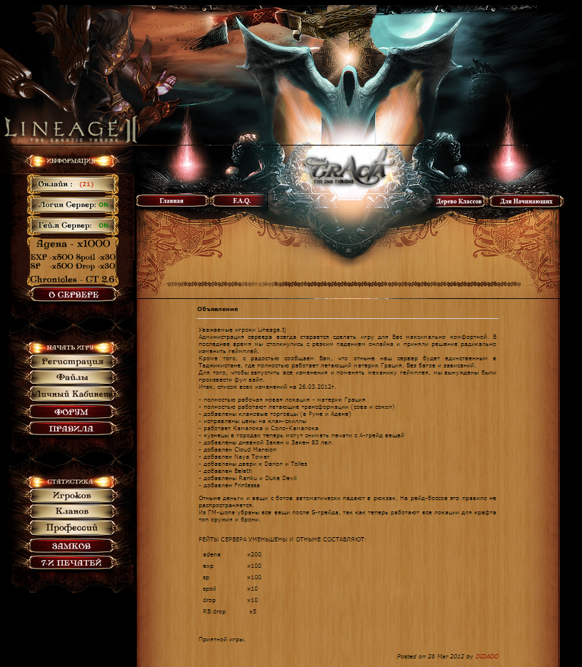 Игровые сервера Lineage II в Таджикистане Как утверждается, первый в Таджикистане игровой сервер Lineage II http://lineage.tj/ запущен 8 февраля 2008 года. На 30 сентября 2013 года на сервере зарегистрировалось 5027 игроков, 87 кланов. Самый многочисленный клан SinCity насчитывает 175 игроков. Наиболее популярная профессия – Adventurer (343 игрока).