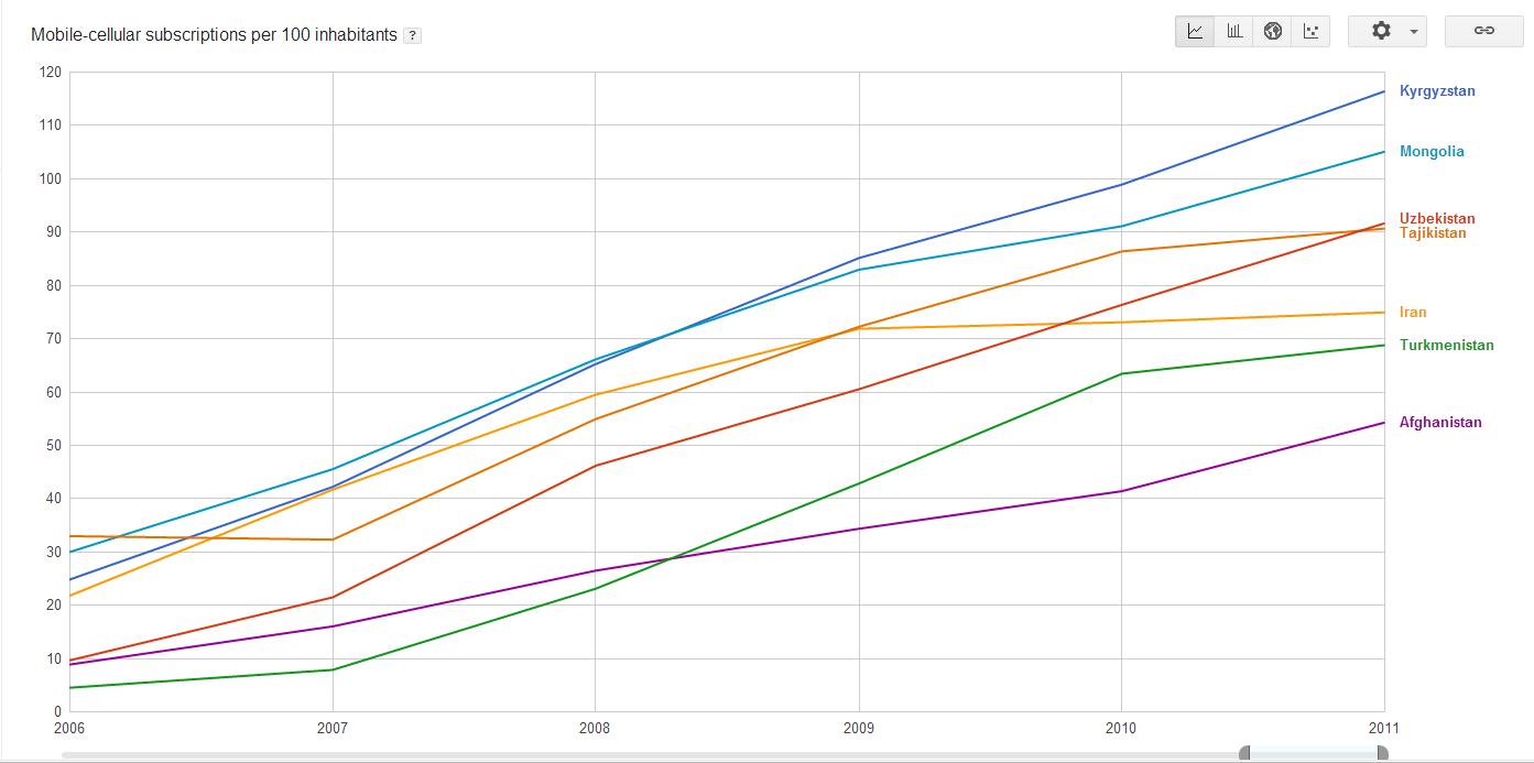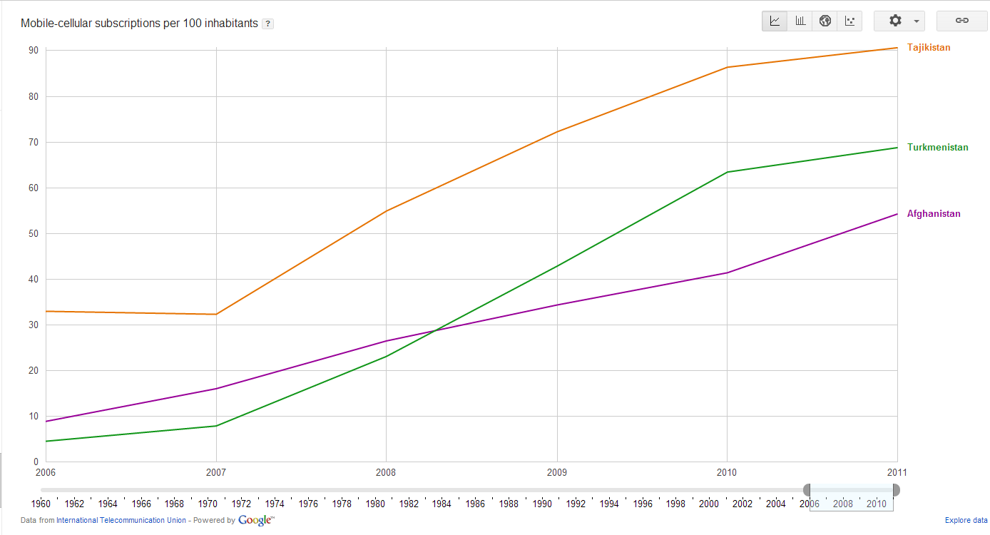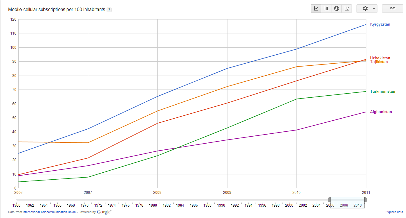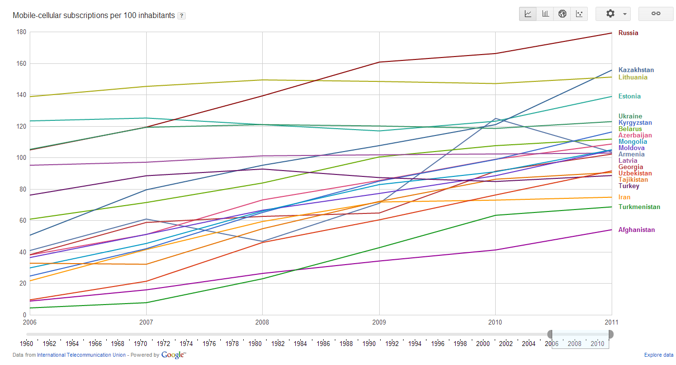 Прогресс Таджикистана в развитии мобильной связи несомненен, что подтверждается показателями уровня проникновения мобильной связи за 2006-2011 годы. Уровень проникновения мобильной связи на рынок страны – один из самых популярных и объективных показателей среди телекоммуникационных компаний – рассчитывается на 100 жителей. Количество абонентов мобильной связи на 100 жителей (3 страны) Диаграммы по уровню проникновения мобильной связи в трех странах (Таджикистан, Туркменистан и Афганистан) и пяти странах (плюс Узбекистан и Кыргызстан) показывают, что Таджикистан в отличие от РУ и КР с их линейным ростом показателей как бы движется от “рубежа к рубежу”, стабилизация на уровне – рост – опять застой. Картина схожа с Туркменистаном, только на разных уровнях. Количество абонентов мобильной связи на 100 жителей (5 стран) Интересно, что количество пользователей мобильной связи в расчете на 100 жителей в Иране стабилизовалось на уровне 72-73 с 2010 года и, скорее всего, можно говорить о насыщении рынка. То есть насыщение рынка для разных стран происходит на разных уровнях, зависит от многих причин, и не стоит брать за ориентир показатели каких-то конкретных стран. Количество абонентов мобильной связи на 100 жителей (7 стран) Возвращаясь к началу этой статьи, где говорилось, что уровень развития Интернет отнюдь не определяется уровнем развития экономики, как раз в отношении развития мобильной связи можно сказать, что уровень проникновения в значительной степени определяется богатством страны. В нашей более чем релевантной выборке из 19 стран впереди Россия и Казахстан. Однако порой это свидетельствует не только о потребительских возможностях. Так многие казахстанские предприниматели, работающие в нескольких регионах или по всей стране, вынуждены подключаться к нескольким провайдерам мобильной связи, которые неспособны или не желают обеспечить полноценную, качественную связь на территории всей страны. То же можно сказать и о России. Здесь стоит отметить динамику показателя проникновения мобильной связи в прибалтийских странах. Заметно насыщение рынка: для Эстонии – где-то на уровне 125-140, для Литвы – 140-150, Латвия – около 100. Это свидетельствует о том, что выбранная потребителем (эстонцем, литовцем, латышом) компания-провайдер связи практически полностью обеспечивает потребности абонента как по качеству и надежности, так и в способности покрыть территорию всей страны. Количество абонентов мобильной связи на 100 жителей (с) Б.Рахимов – специально для Tajik Development Gateway, 2013 Новость по теме: Почему в Казахстане Интернет медленнее, чем в Монголии