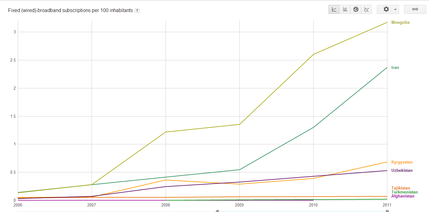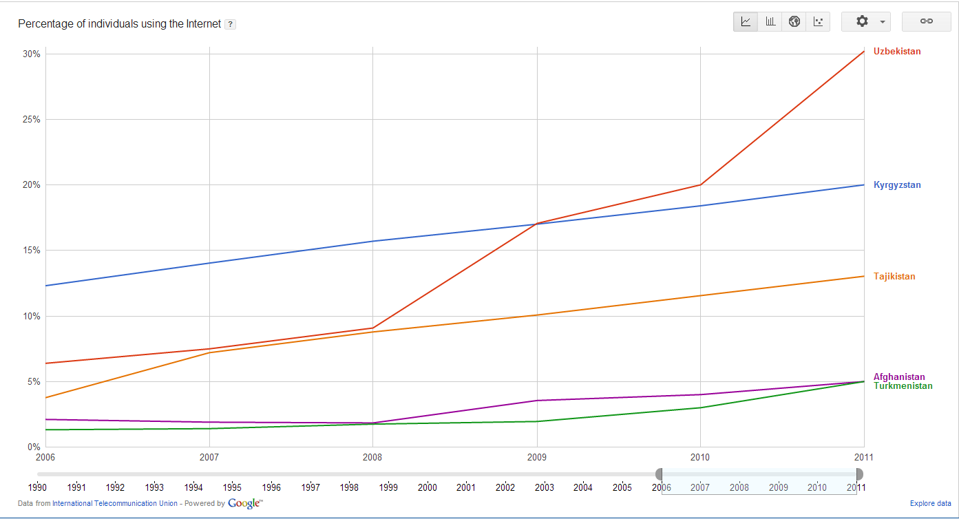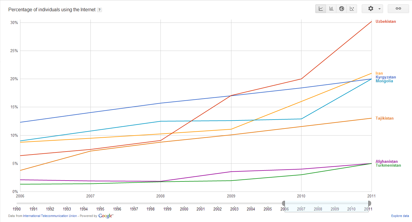Выше уже упоминалась диаграмма по использованию Интернета в трех странах: Таджикистане, Туркменистане и Афганистане. Вторая диаграмма иллюстрирует рост пользования Интернета еще в двух странах-соседях Таджикистана: Узбекистане и Кыргызстане. Видно что в последние годы темпы прироста доли пользователей Интернет в Таджикистане и Кыргызстане примерно равны, то есть при сохранении таких тенденций Таджикистан в ближайшие годы не сможет “догнать и перегнать” соседа. Скептики всегда смогут найти достаточно убедительные аргументы почему проблематично резко повысить темпы прироста: “нет таких финансовых ресурсов как в Узбекистане”, “в Кыргызстане много русскоязычных айтишников” и т.п. Доля пользователей Интернет в 5 странах Однако пример Ирана и Монголии свидетельствует, что резкий прирост темпа проникновения Интернета вполне возможен. Почему для сравнения были выбраны Иран и Монголия? Иран – это понятно, культура и язык близки для Таджикистана, что должно сказываться на сходных потребностях в информации и каналах доставки информации, в т.ч. и Интернета. Монголия же сходна с Таджикистаном, Кыргызстаном как небольшая “landlocked”(не имеющая выхода к морю) страна, в свое время была тесна связана с экономикой бывшего СССР, недаром ее называли “шестнадцатой республикой”. Иран достиг уровня Кыргызстана за два года, Монголия – за год. 3 года работы – и Узбекистан не только значительно опередил Кыргызстан, но и приблизился к Армении и Украине. За цифрами роста/прироста – повышение уровня жизни людей, улучшение доступа к информации для удовлетворения личных и корпоративных потребностей, повышение эффективности государственных органов. Доля пользователей Интернет в 7 странах