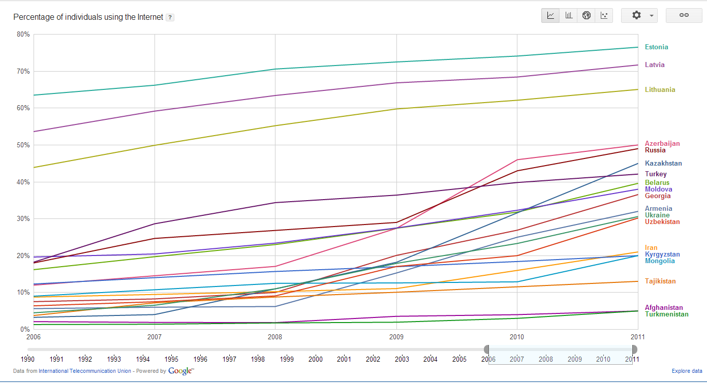Еще пара выводов этого сравнительного анализа по проникновению Интернета. Довольно часто в исследованиях различного характера (экономических, социальных, политических) сравниваются показатели стран бывшего СССР со странами Европы (чаще всего по регионам: Западной, Восточной, Северной и Южной Европы). Можно отметить, что по показателям развития Интернета ряд стран бывшего ССР существенно опережают не самые отсталые страны Европы, например Турция отстает от России, Азербайджана и Казахстана, не говоря уже о прибалтийских странах. Так что опыт Турции вряд ли будет способствовать развитию ИКТ в Таджикистане. А вот зачем простому эстонцу Интернет? Три четверти эстонцев пользуются возможностями всемирной сети, сберегая время и деньги – оформляют большинство документов он-лайн через порталы государственных учреждений, покупают товары в интернет-магазинах, оплачивают коммунальные услуги через Интернет. Интернет-по-эстонски – это эффективно и практично. К этому надо стремиться и это вполне достижимо. Доля пользователей Интернет