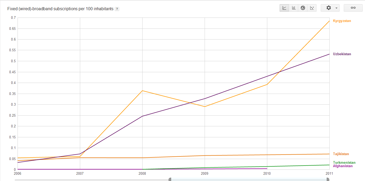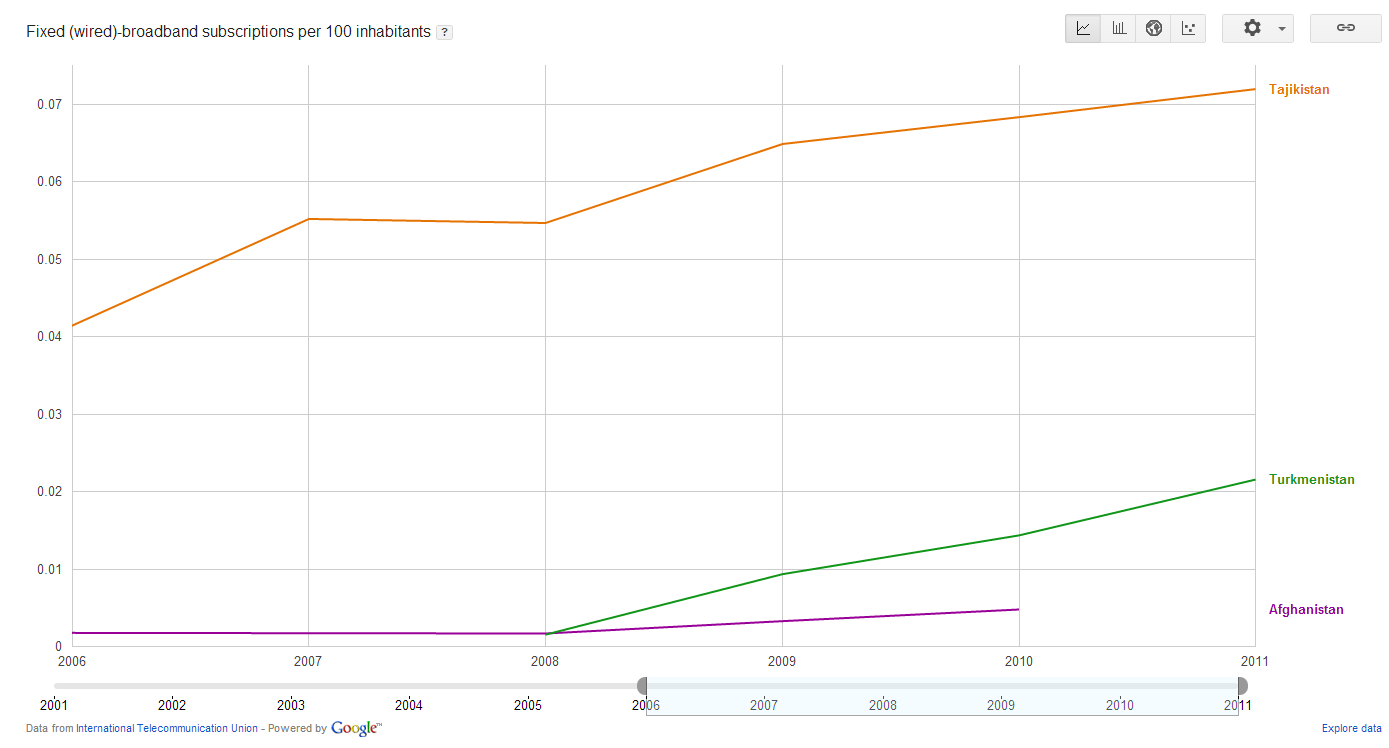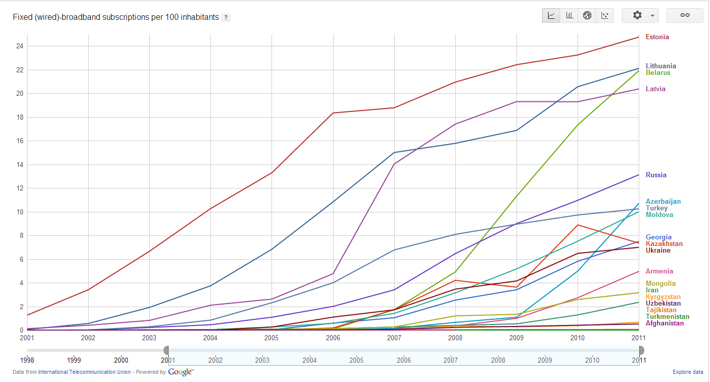 Широкополосный или высокоскоростной доступ в Интернет — доступ в Интернет со скоростью передачи данных, превышающей максимально возможную при использовании коммутируемого доступа с использованием модема и телефонной сети общего пользования. Осуществляется с использованием проводных, оптоволоконных и беспроводных линий связи различных типов.Кроме высокой скорости, широкополосный доступ обеспечивает непрерывное подключение к Интернету (без необходимости установления коммутируемого соединения) и так называемую «двустороннюю» связь, то есть возможность как принимать («загружать»), так и передавать («выгружать») информацию на высоких скоростях. Выделяют мобильный широкополосный доступ (мобильный ШПД) и фиксированный широкополосный доступ. Фиксированный ШПД строится на основе проводных соединений, в то время как мобильный ШПД включает в себя передачу данных по беспроводным соединениям. Количество абонентов фиксированного широкополосного доступа в Интернет на 100 жителей (3 страны) Показатель “Количество абонентов фиксированного широкополосного доступа в Интернет на 100 жителей” при рассмотрении 5 стран ясно и недвусмысленно показывает одну из существенных причин отставания Таджикистана по использованию Интернета – отсутствие соответствующей современной инфраструктуры для доступа в сеть, а именно систем и сетей фиксированного широкополосного доступа в Интернет. Количество абонентов фиксированного широкополосного доступа в Интернет на 100 жителей (5 стран) Упомянутый выше резкий прирост темпа проникновения Интернета в Иране и Монголии как раз объясняется существенным увеличением количества абонентов фиксированного широкополосного доступа в Интернет, то есть не экстенсивным развитием существующих телекоммуникационных систем и сетей, а внедрением и развитием современных и эффективных систем и сетей ФШПД. Количество абонентов фиксированного широкополосного доступа в Интернет на 100 жителей (7 стран) В последние годы по показателю количества абонентов фиксированного широкополосного доступа в Интернет на 100 жителей к тройке лидеров на пост-советском пространстве – Эстонии, Латвии и Литве – присоединилась Беларусь, которая обладает высоким кадровым потенциалом в сфере информационных технологий. В ближайшие годы это безусловно скажется на росте проникновения Интернета в Беларуси до уровня стран Европейского Союза. Также стоит отметить, что внедрение фиксированного ШПД экономически выгодно в странах/регионах с преобладающим городским населением, то есть при развитии фиксированного широкополосного доступа в Интернет в Таджикистане (да и в других странах со значительными сельскими местностями – Кыргызстане, Узбекистане, Грузии, Армении, Азербайджане) необходимо изучать опыт развитых стран со сходными условиями. Возможно, Турция в последние годы как раз столкнулась с этими естественными ограничениями, что и объясняет снижение темпов прироста показателей ИКТ для этой страны. Количество абонентов фиксированного широкополосного доступа в Интернет на 100 жителей